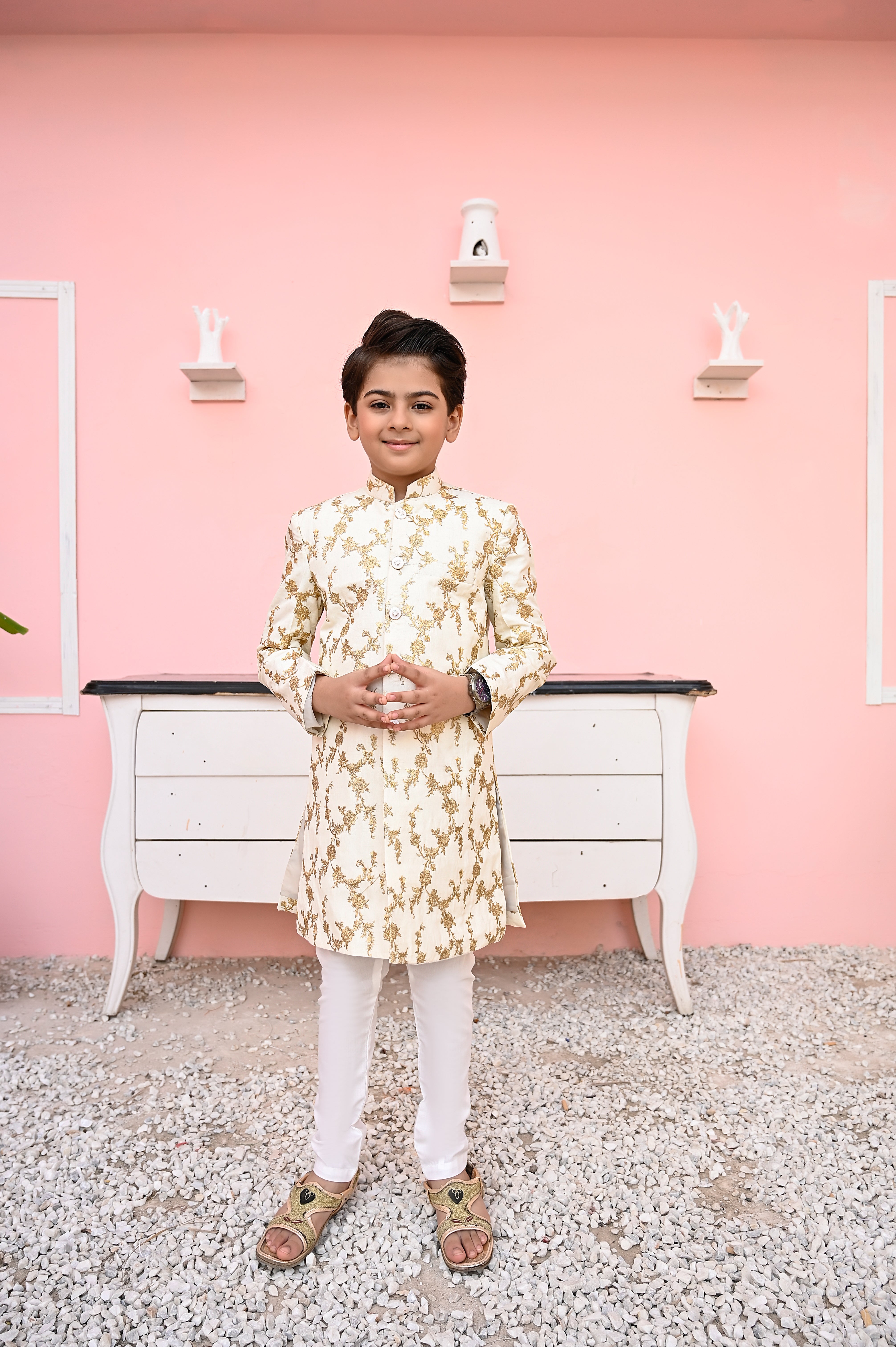 This sherwani is made from luxurious fabric with intricate golden embroidery. The golden threadwork adds a touch of elegance and royalty to the outfit. The design is carefully crafted, showcasing traditional motifs and patterns.