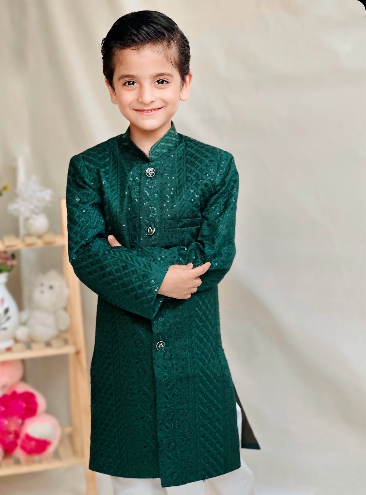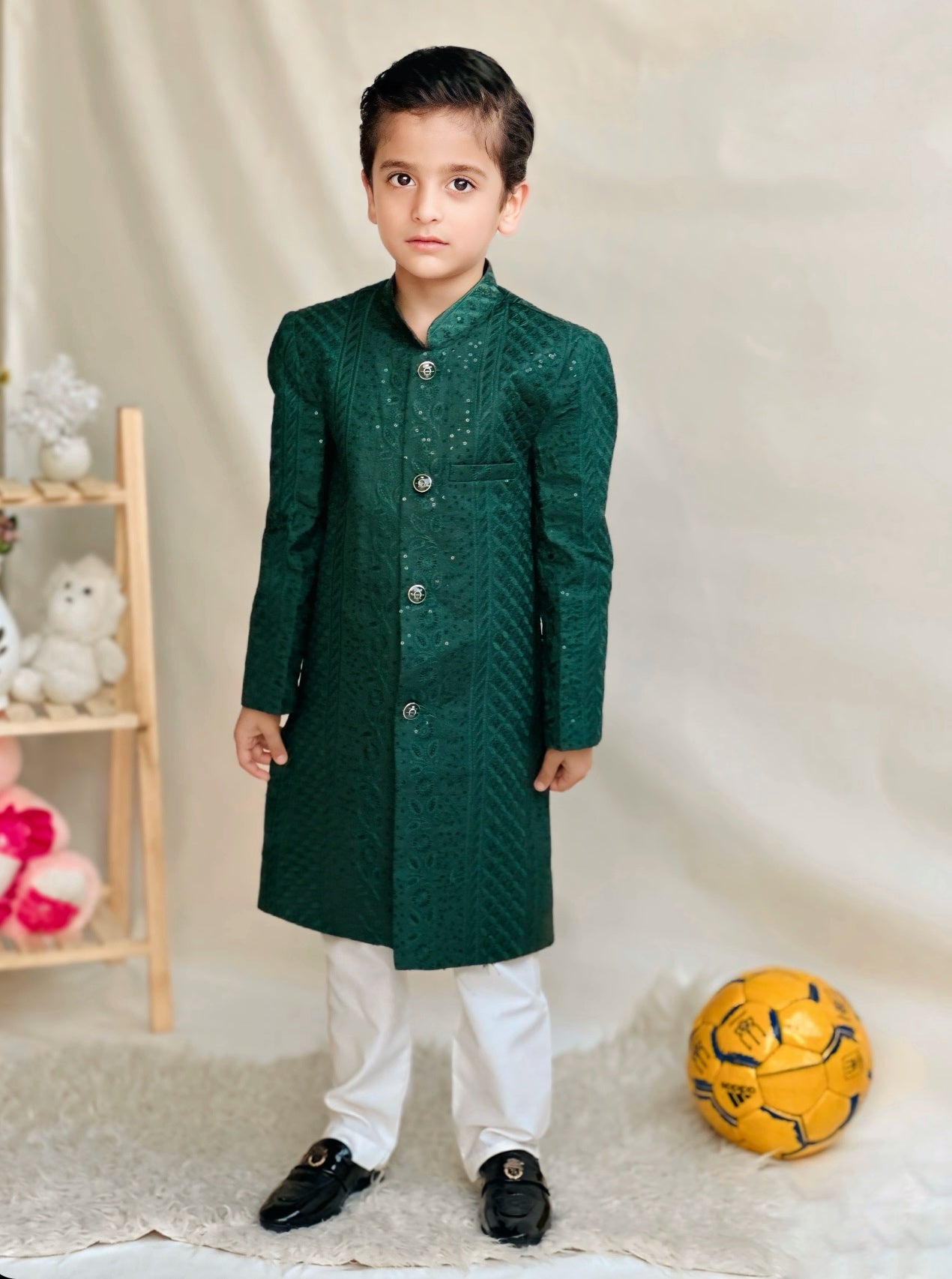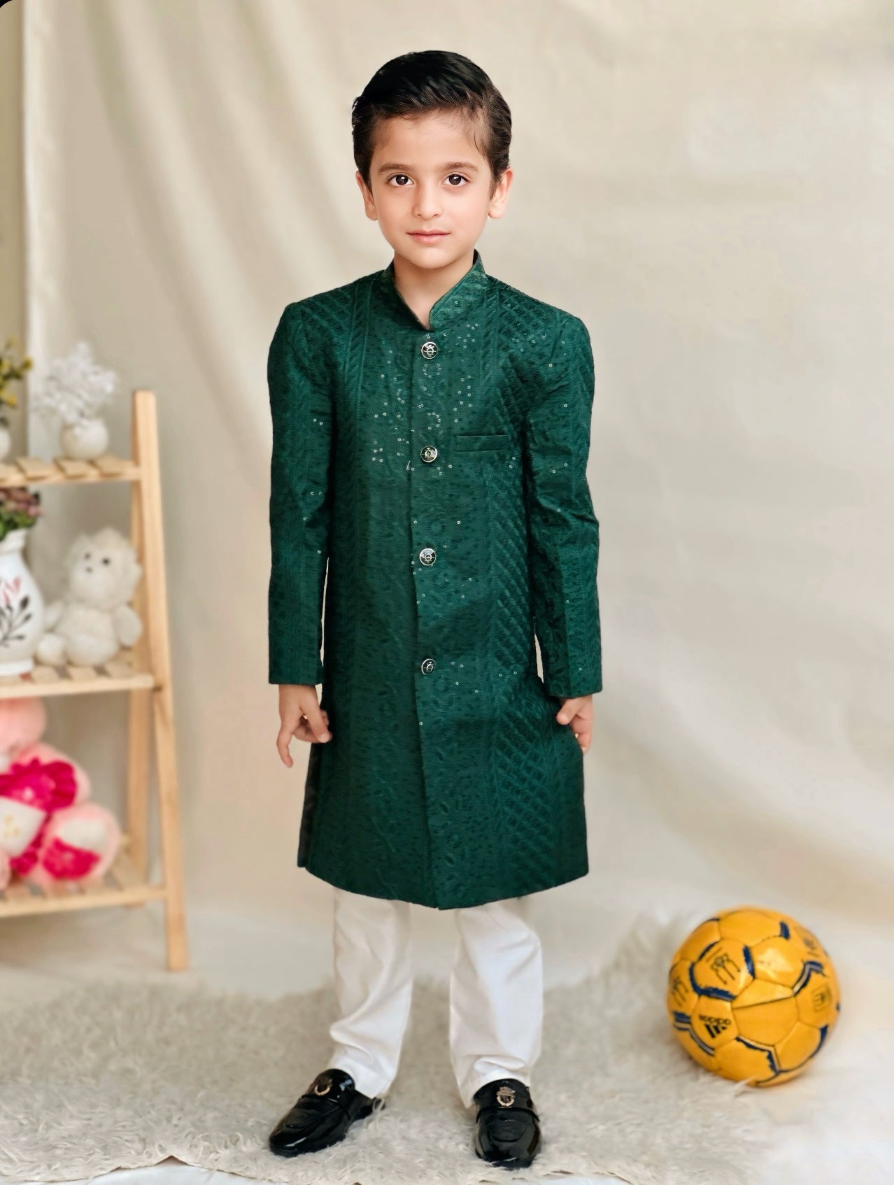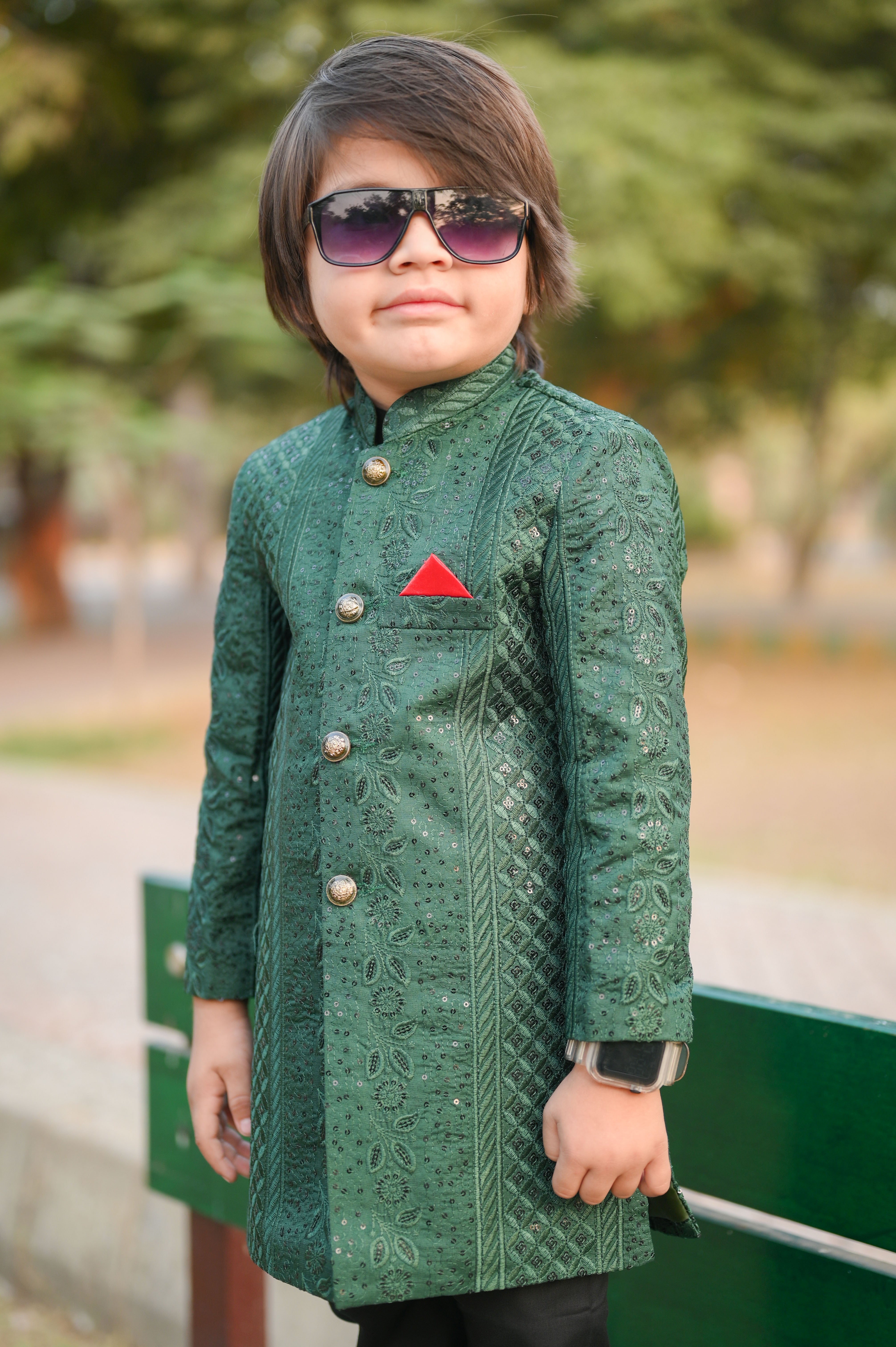 This black sherwani is of raw silk fabric which gives a luxurious and elegant look. It is adorned with intricate embroidered sequin work adding a touch of sparkle and glamour. The combination of black color and the beautiful detailing makes this sherwani a perfect choice for any special occasion