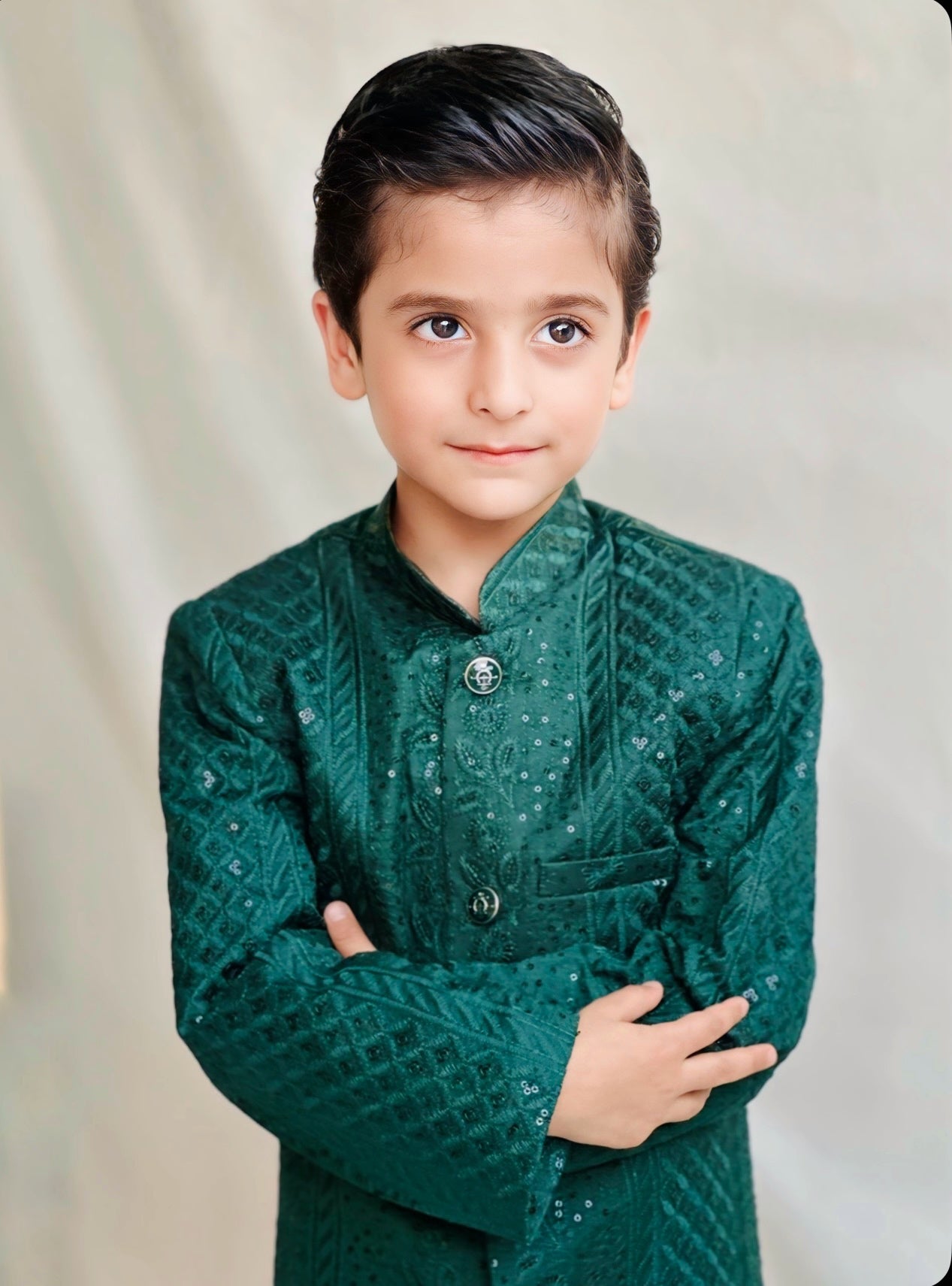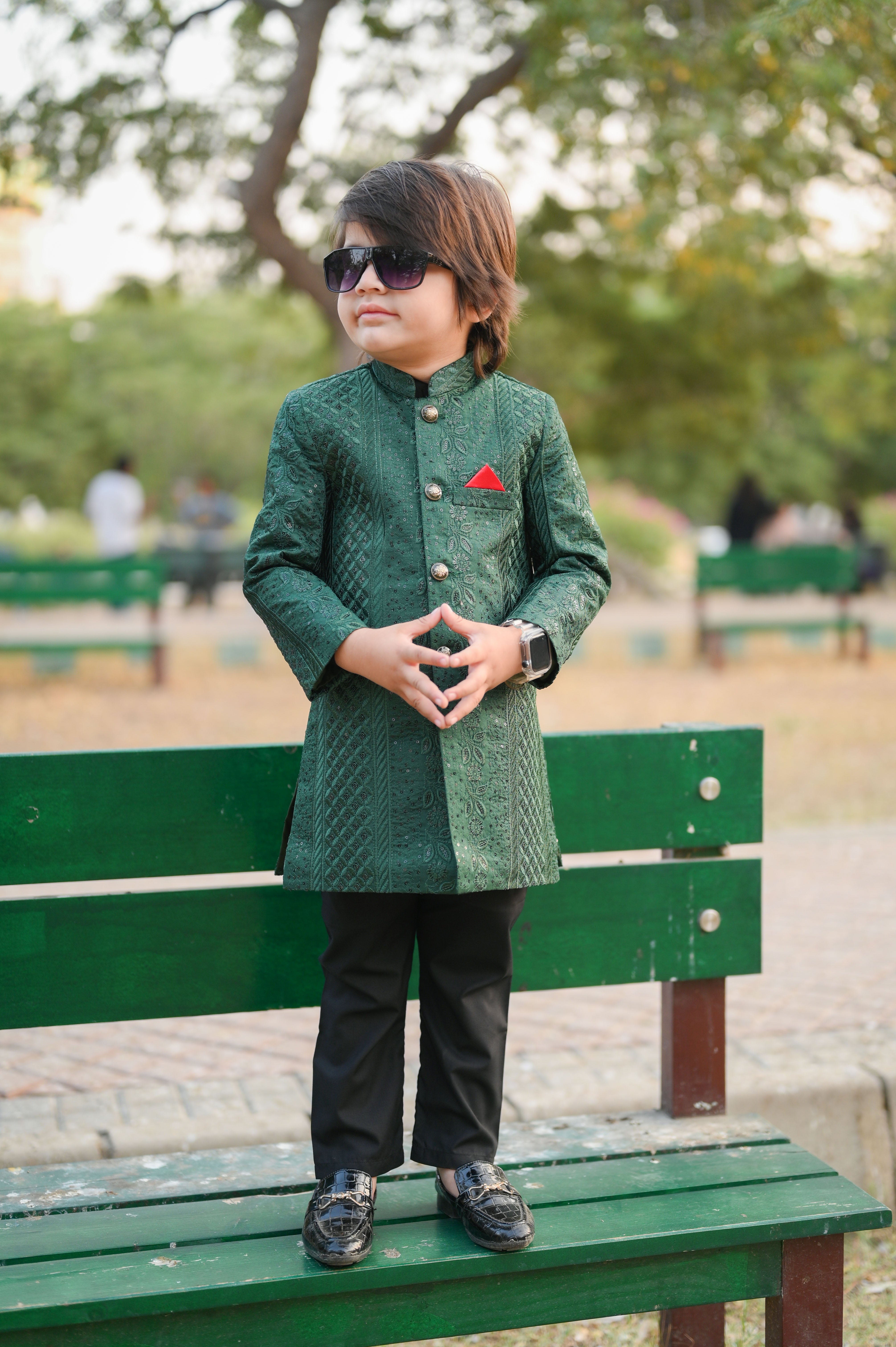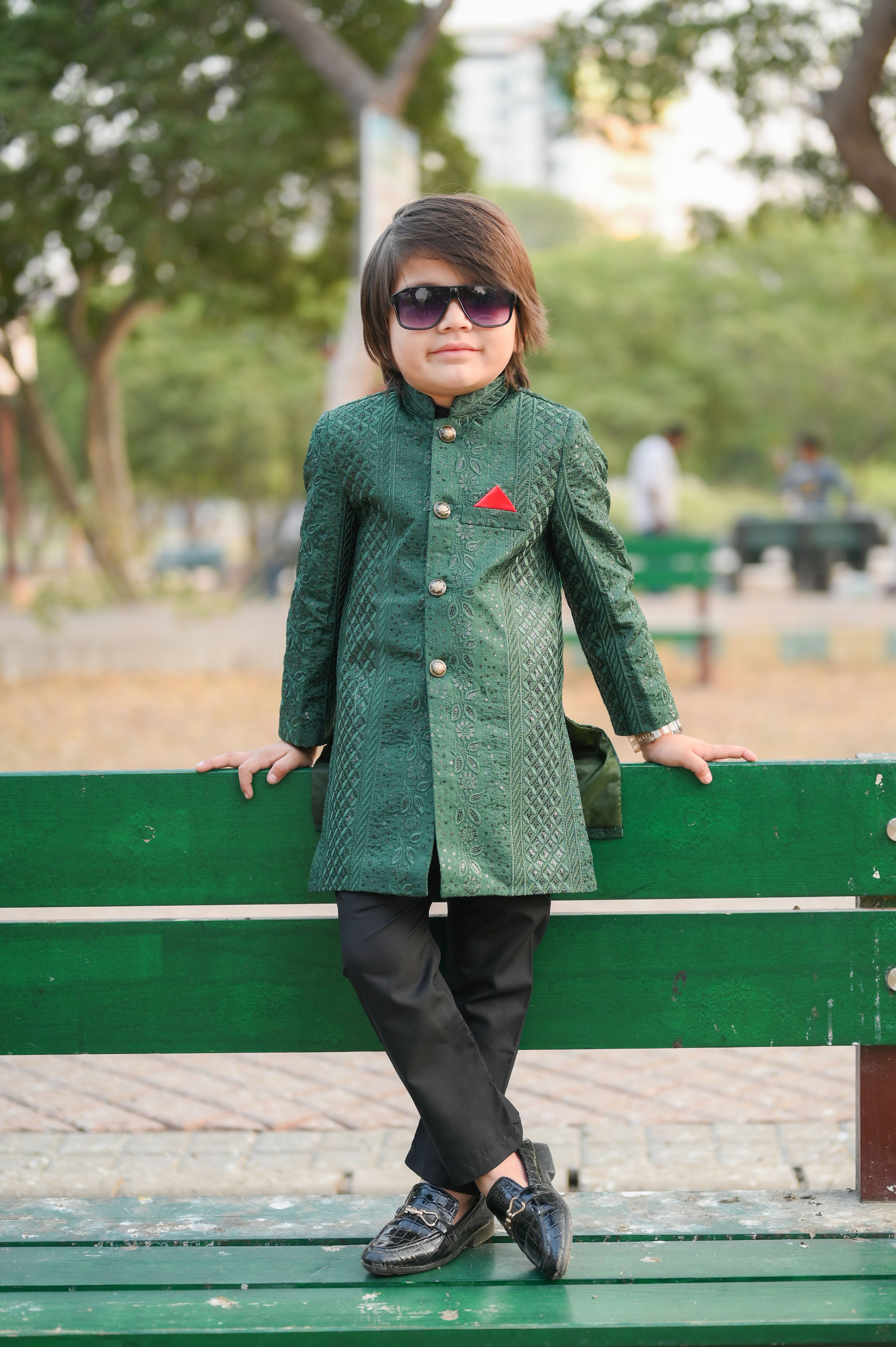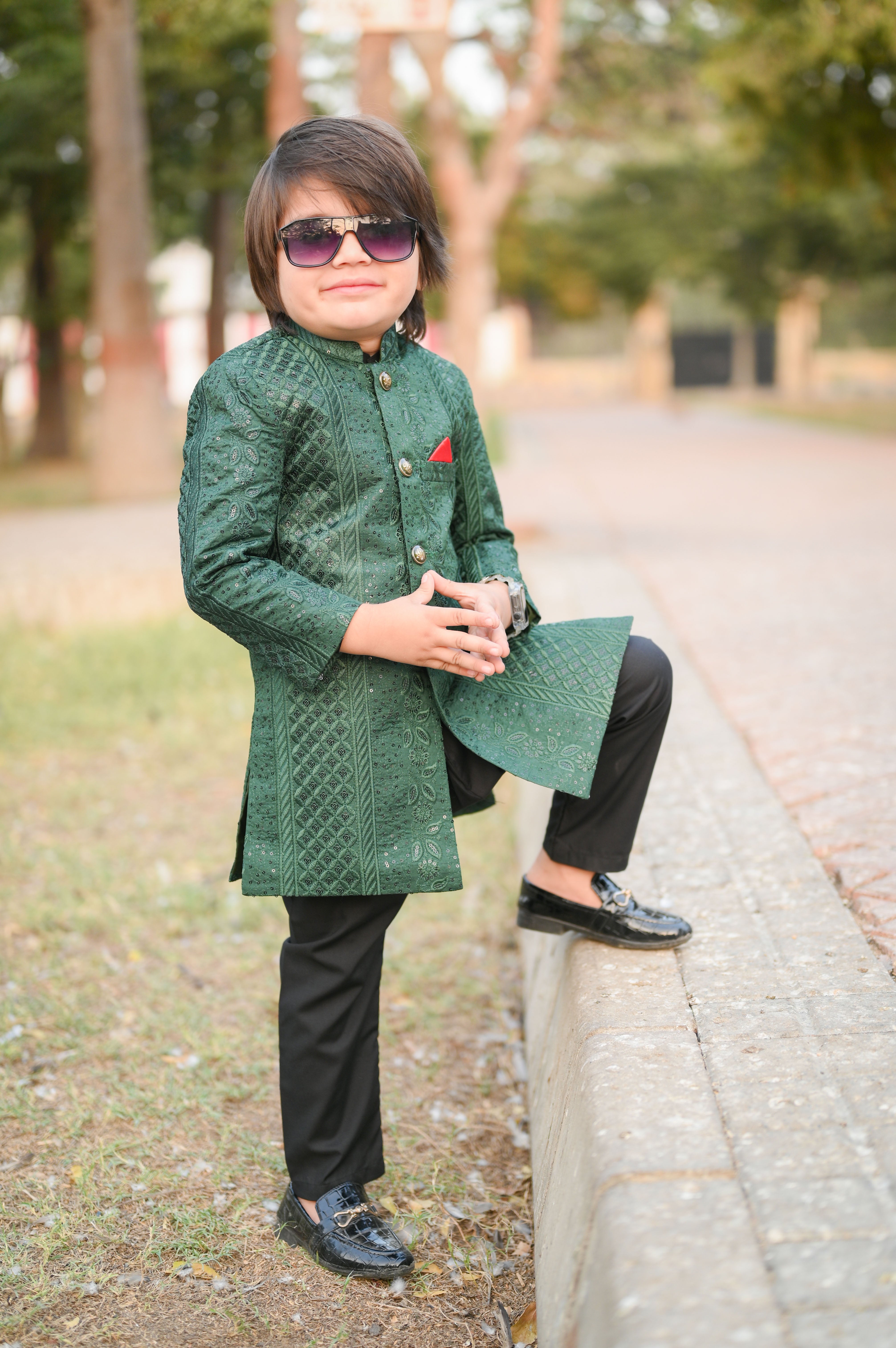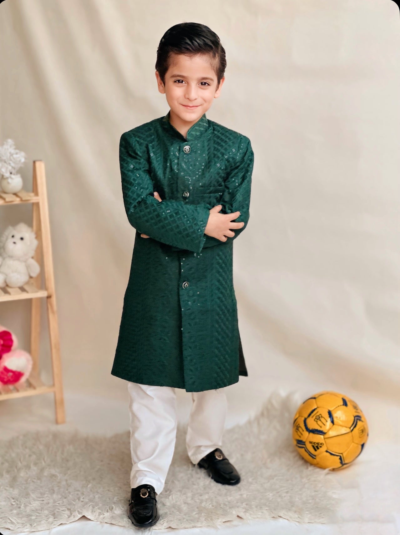 This black sherwani is of raw silk fabric which gives a luxurious and elegant look. It is adorned with intricate embroidered sequin work adding a touch of sparkle and glamour. The combination of black color and the beautiful detailing makes this sherwani a perfect choice for any special occasion
