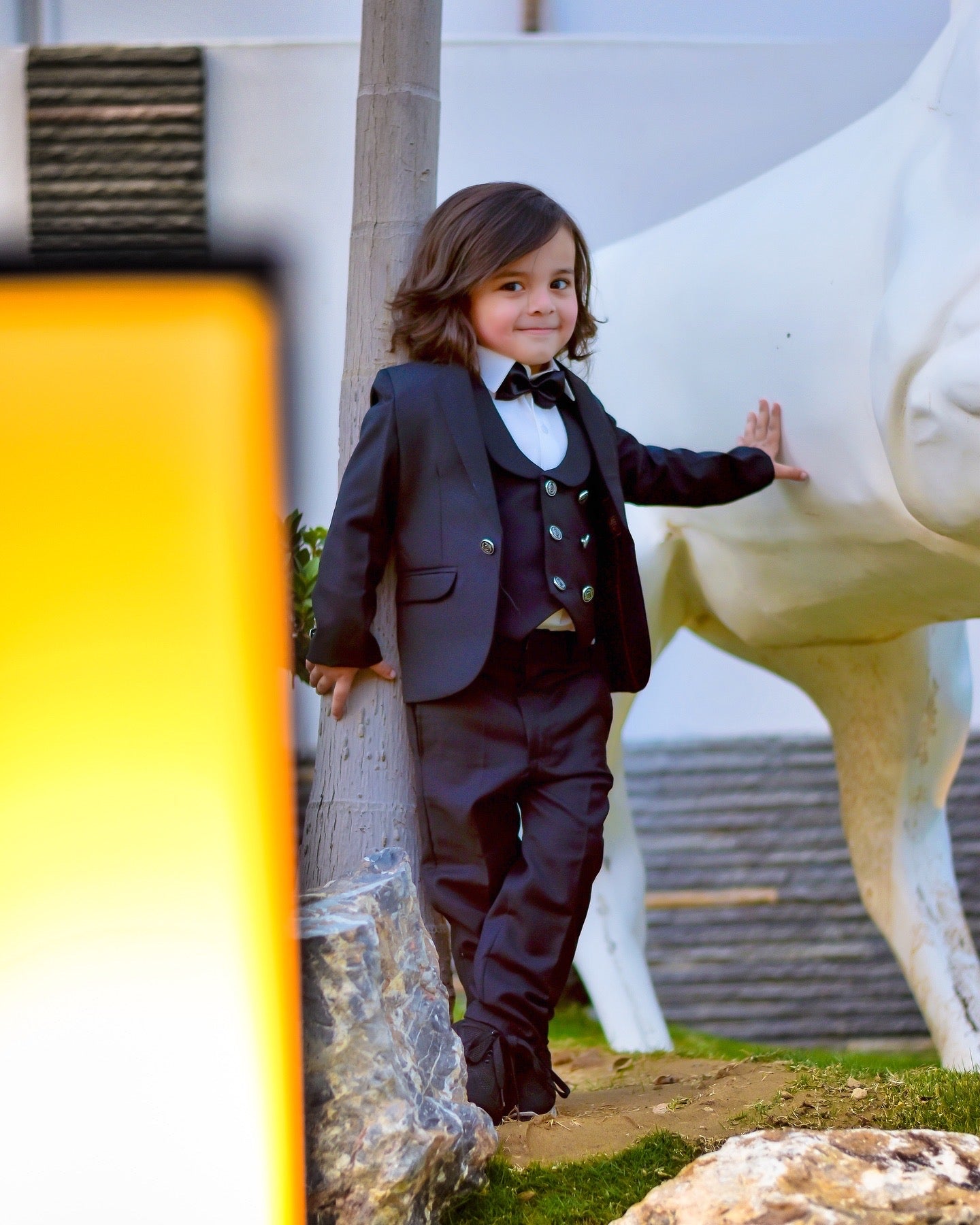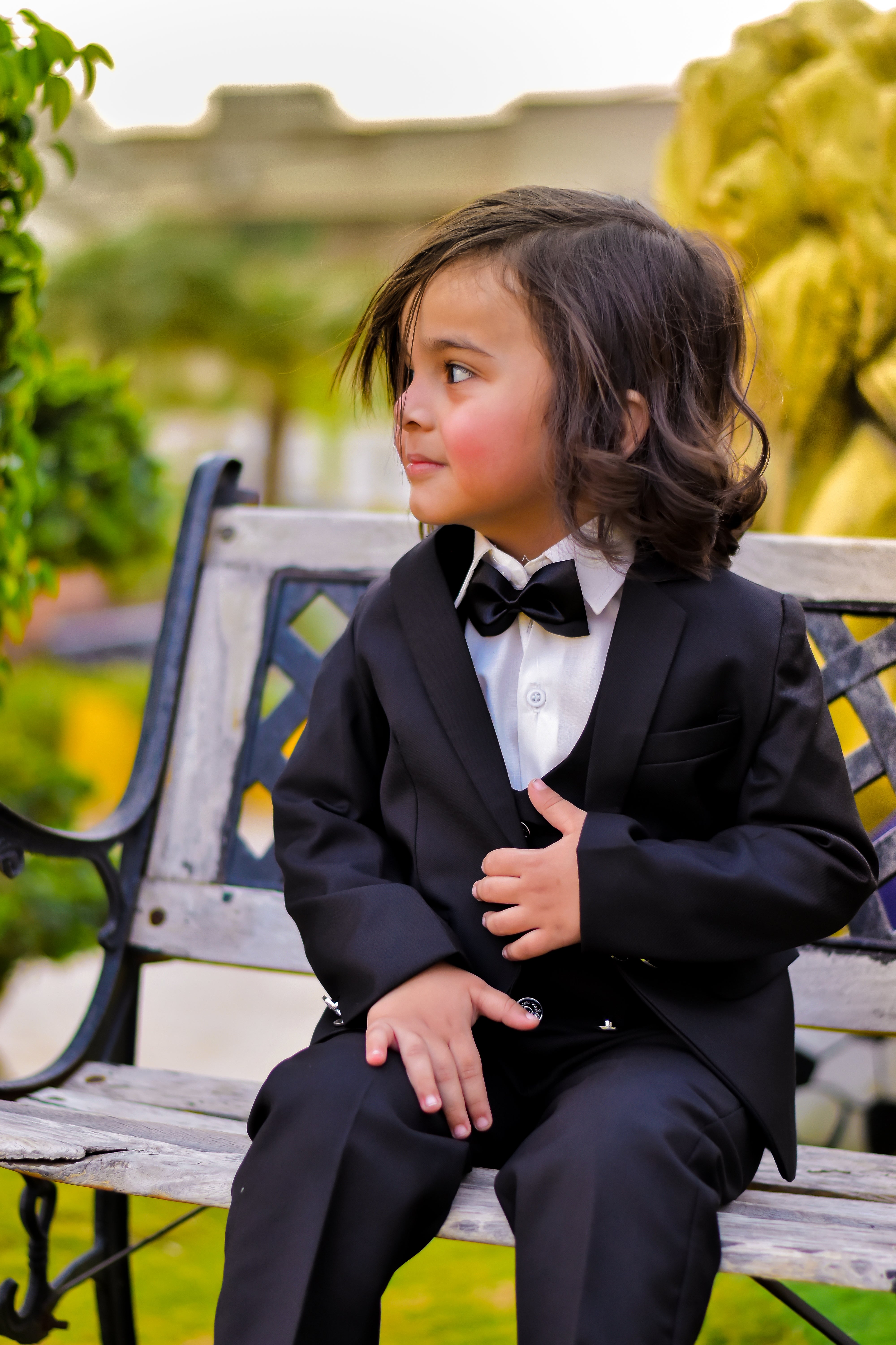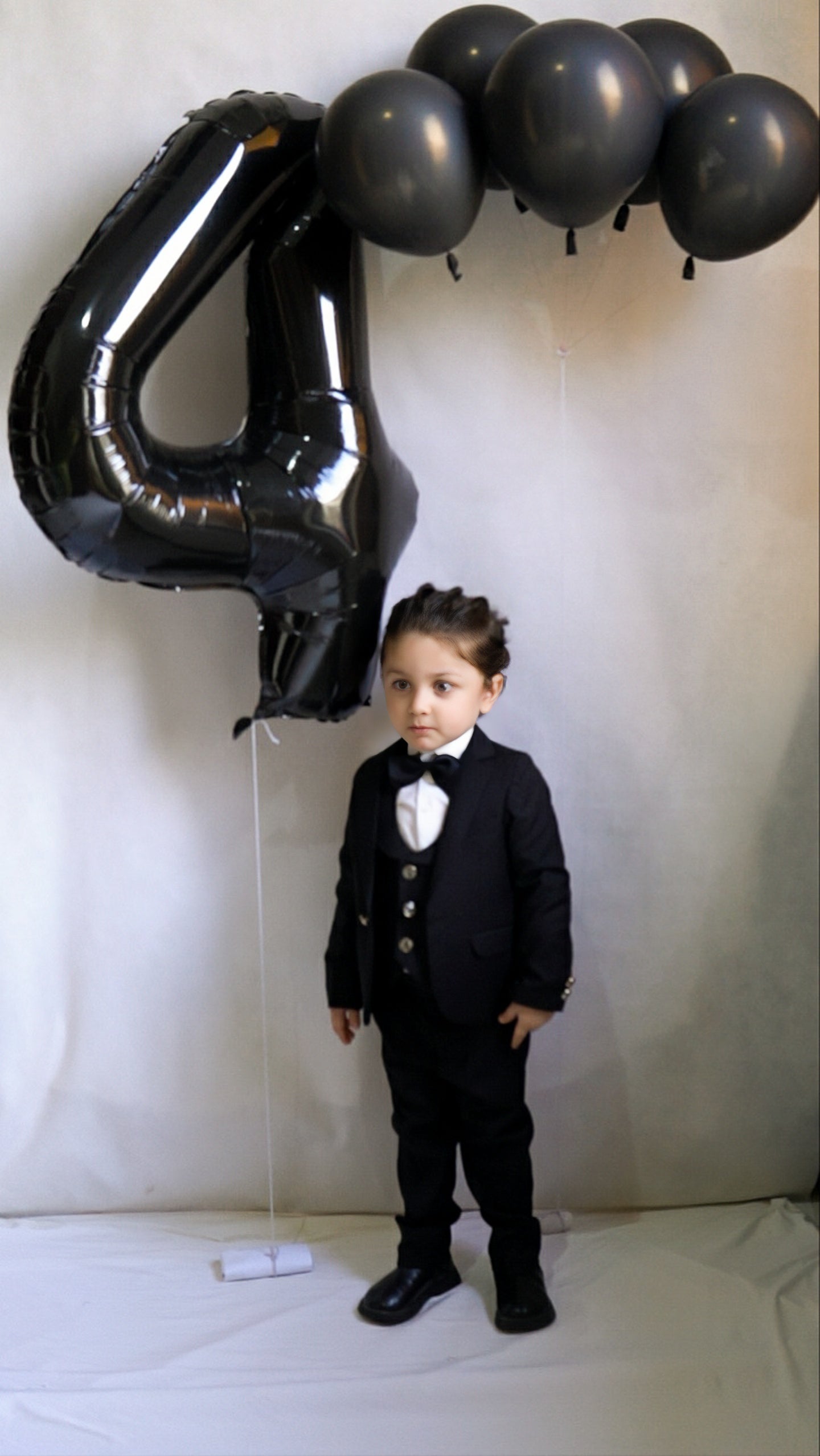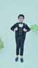The suit features a sleek black coat with a tailored fit, giving you a polished and sophisticated look. The pants are perfectly matched, providing a clean and streamlined silhouette. The waistcoat adds an extra touch of style, with its matching black fabric and button detailing. The bow completes the ensemble, adding a touch of elegance and charm.Its a classic and timeless outfit that exudes confidence and class.