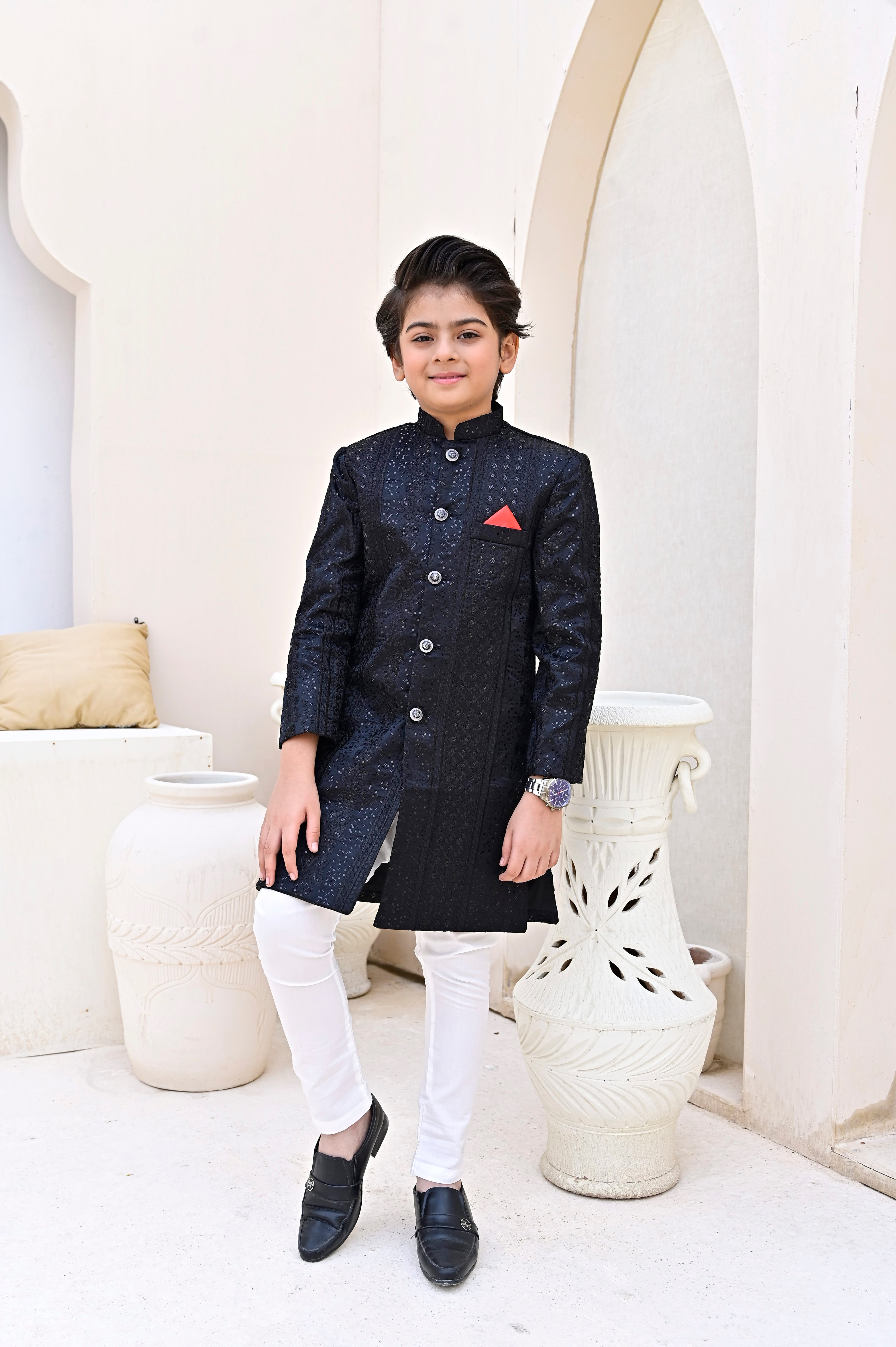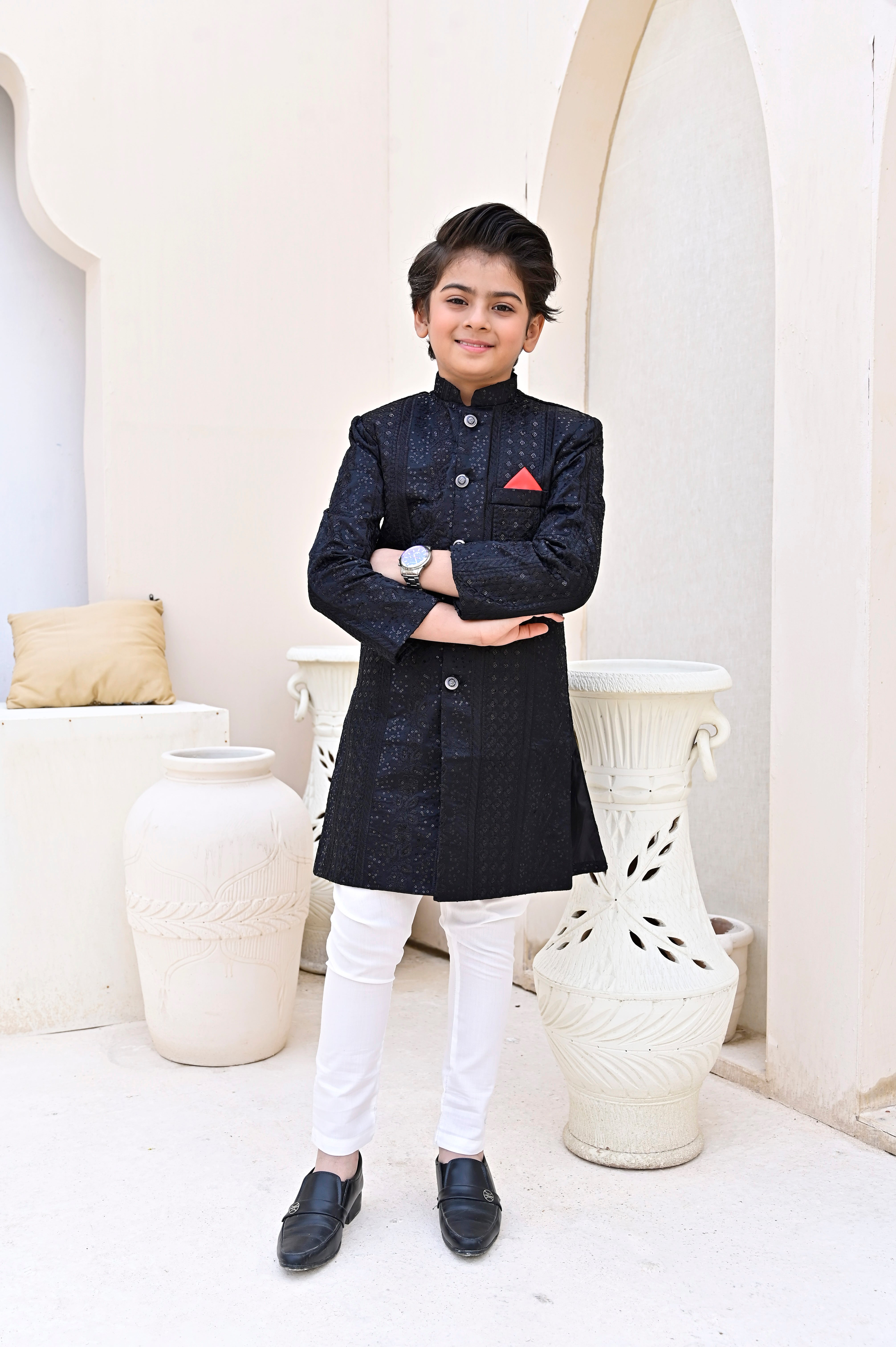 This black sherwani is of raw silk fabric which gives a luxurious and elegant look. It is adorned with intricate embroidered sequin work adding a touch of sparkle and glamour. The combination of black color and the beautiful detailing makes this sherwani a perfect choice for any special occasion.