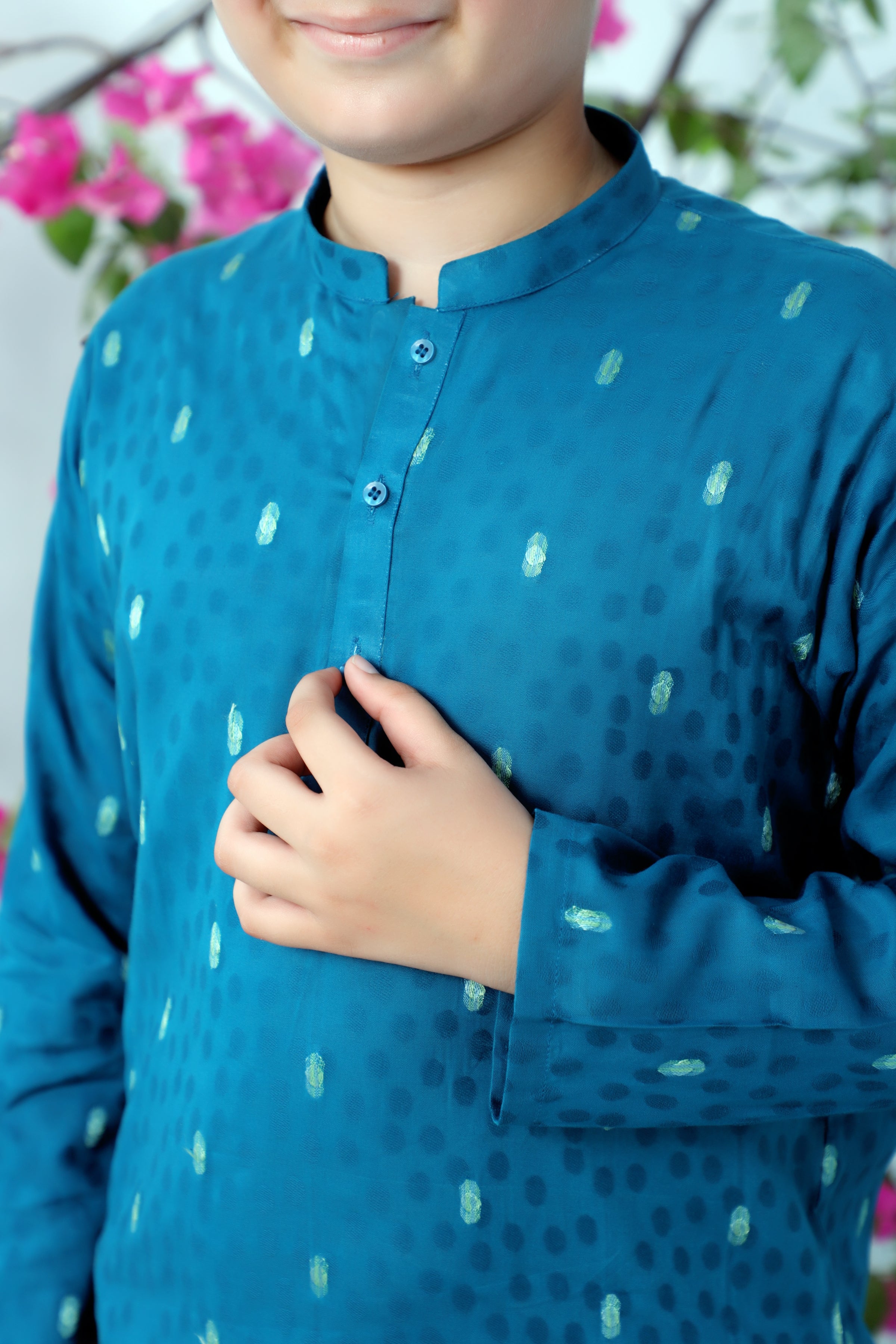 • The kurta is a stylish shade of Bondi Blue and features intricate detailing work, which adds a touch of elegance. The Cotton fabric makes it super convenient to maintain. The pajama is a White olocr, completing the look with a comfortable fit. It's the perfect combo of style and ease!