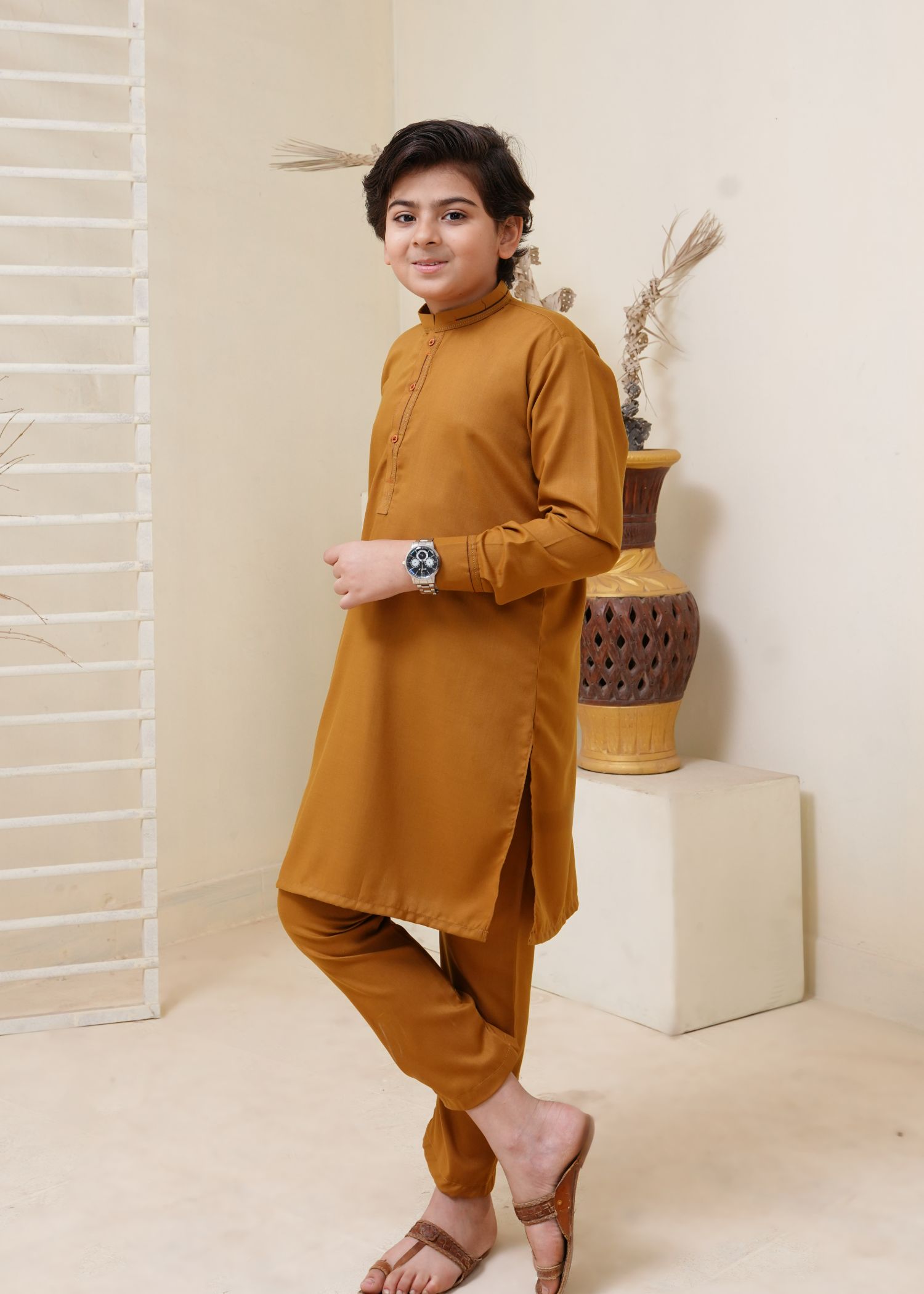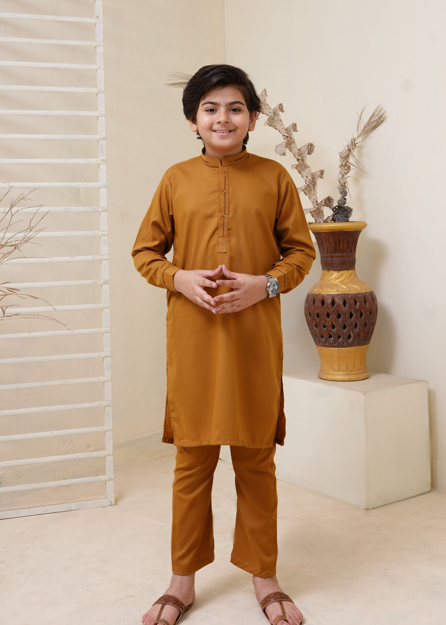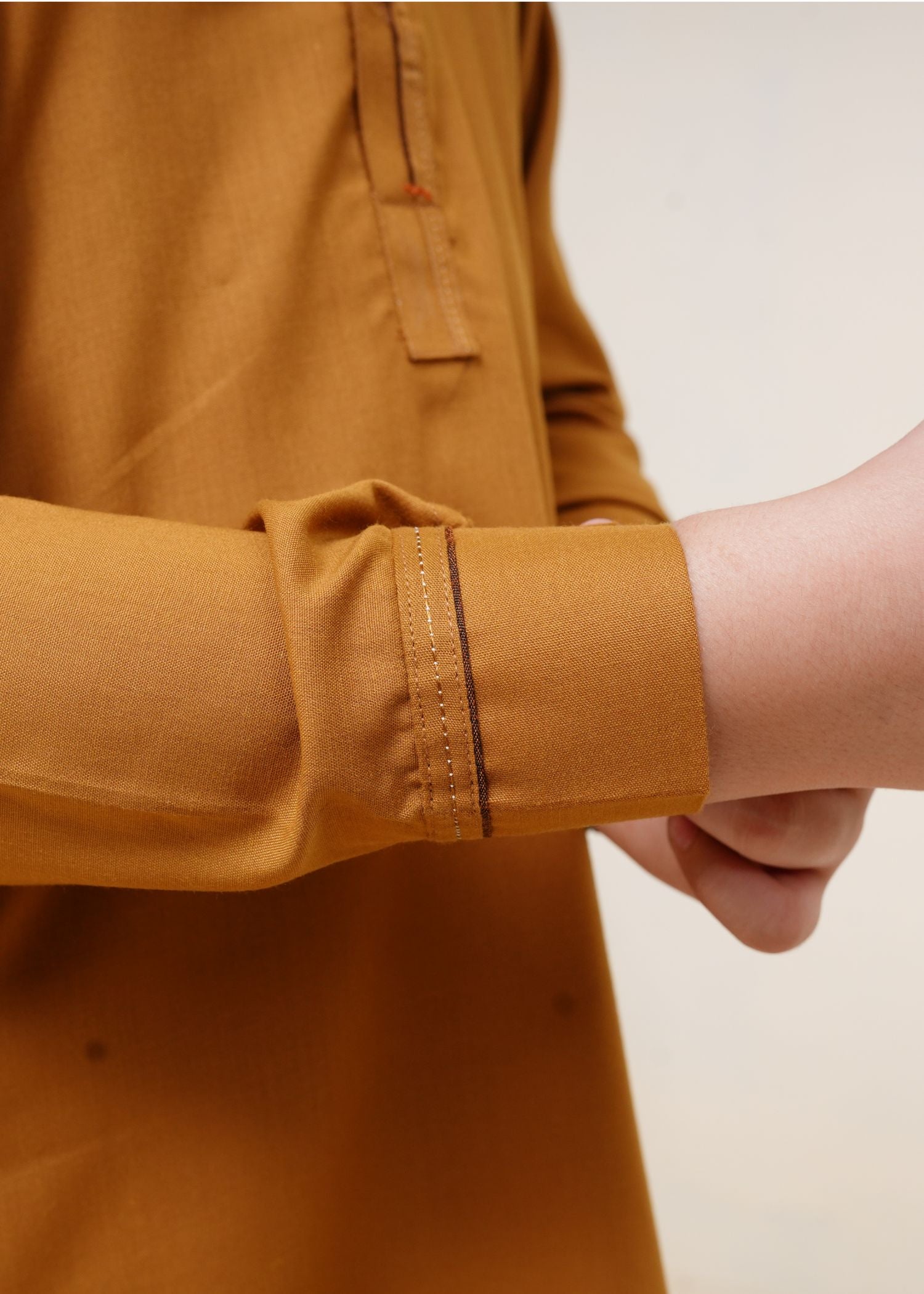The mustard kurta is a stylish shade and features intricate detailing work, which adds a touch of elegance. The wash and wear fabric makes it super convenient to maintain. The pajama is a matching mustard color, completing the look with a comfortable fit. It's the perfect combo of style and ease!