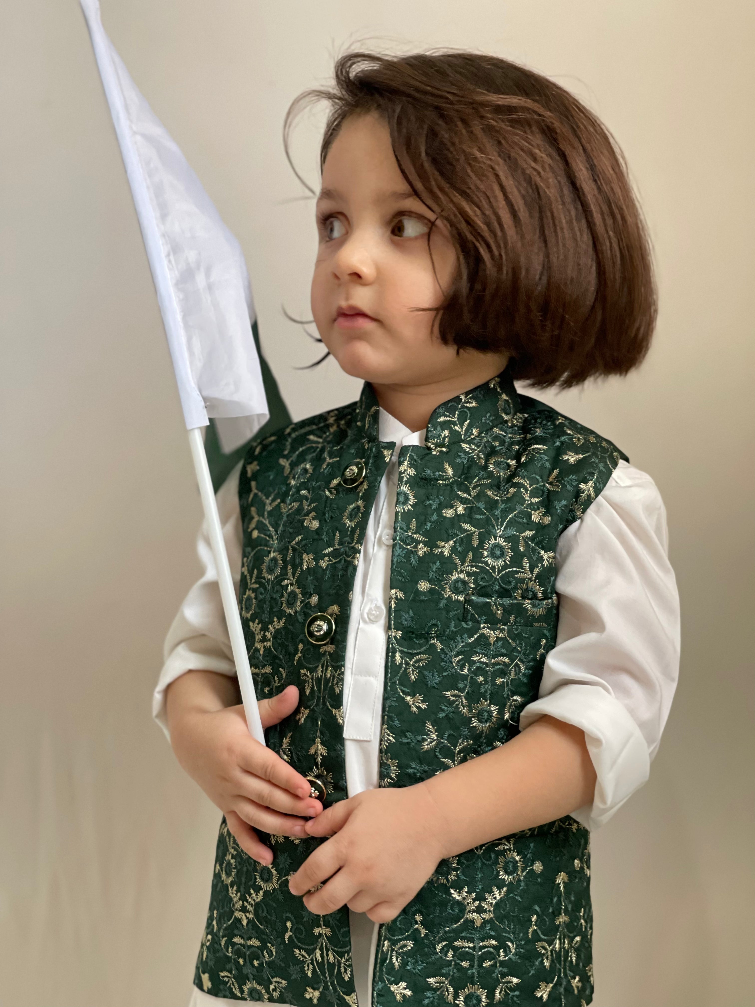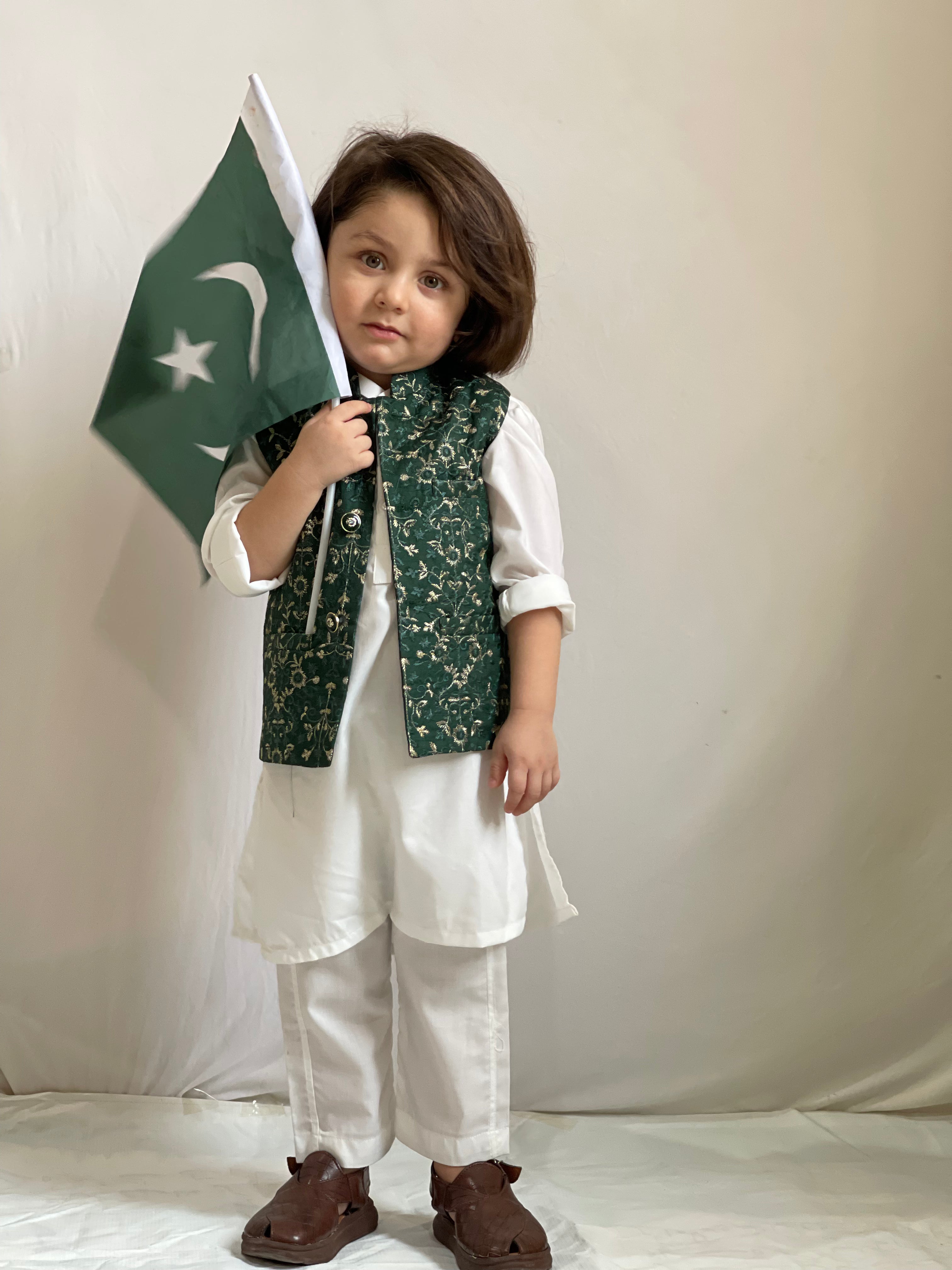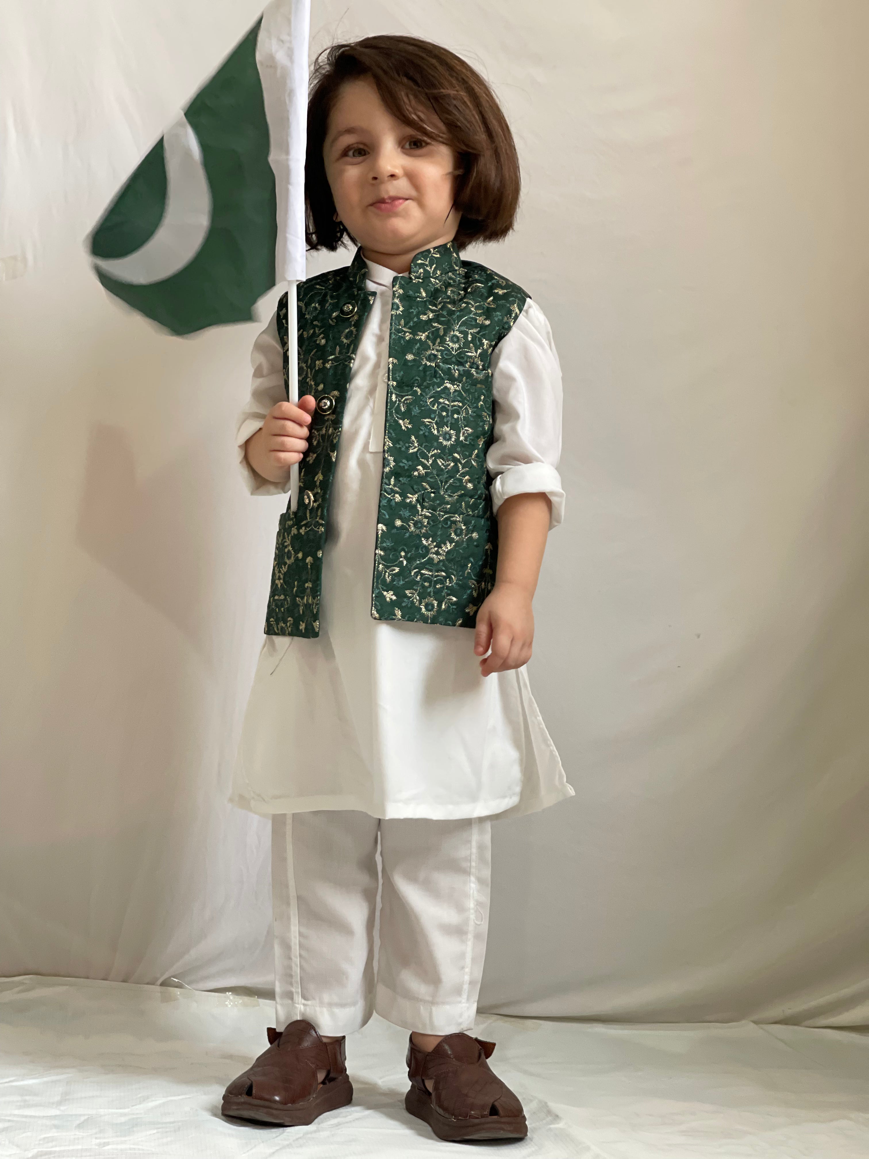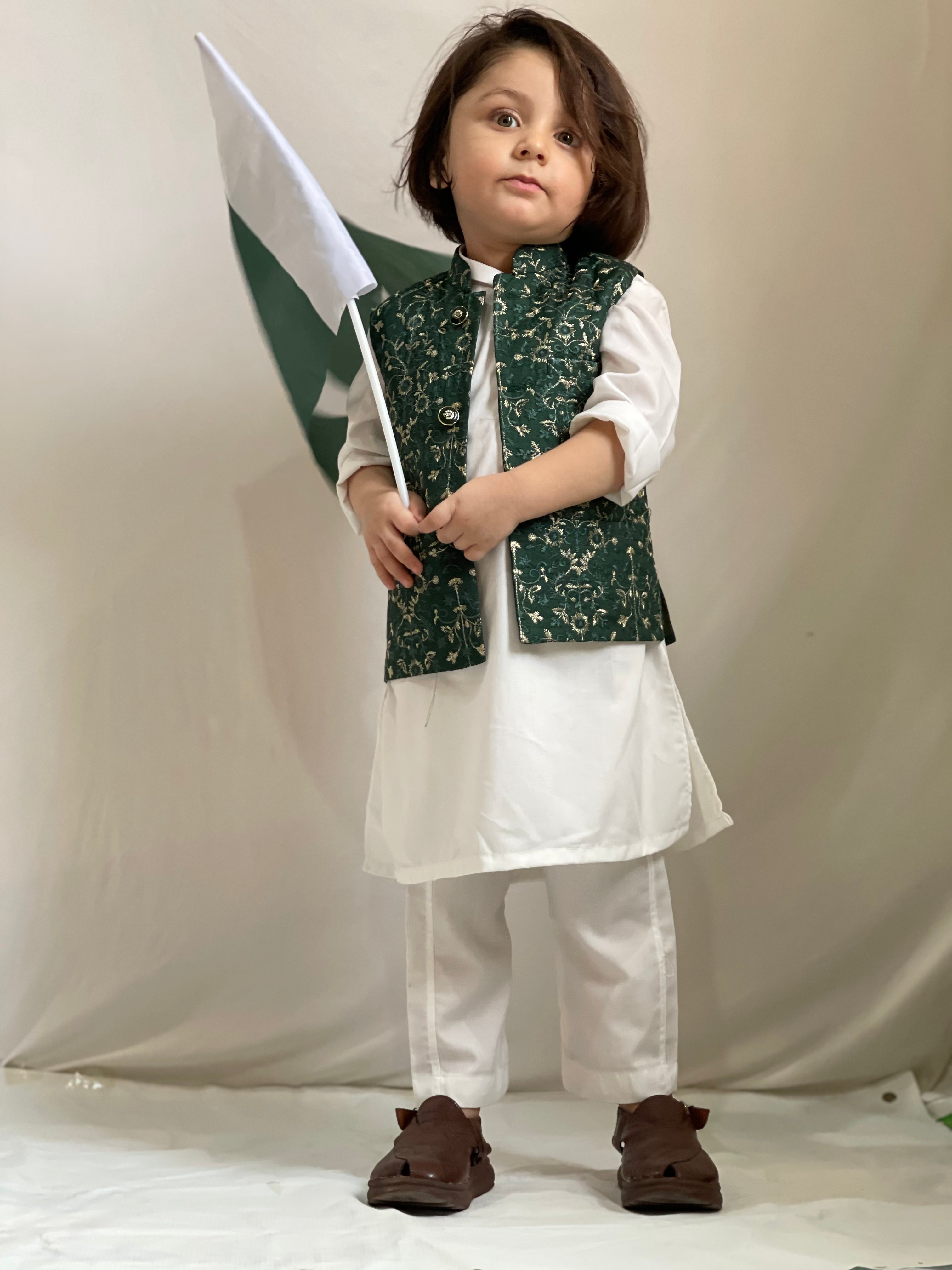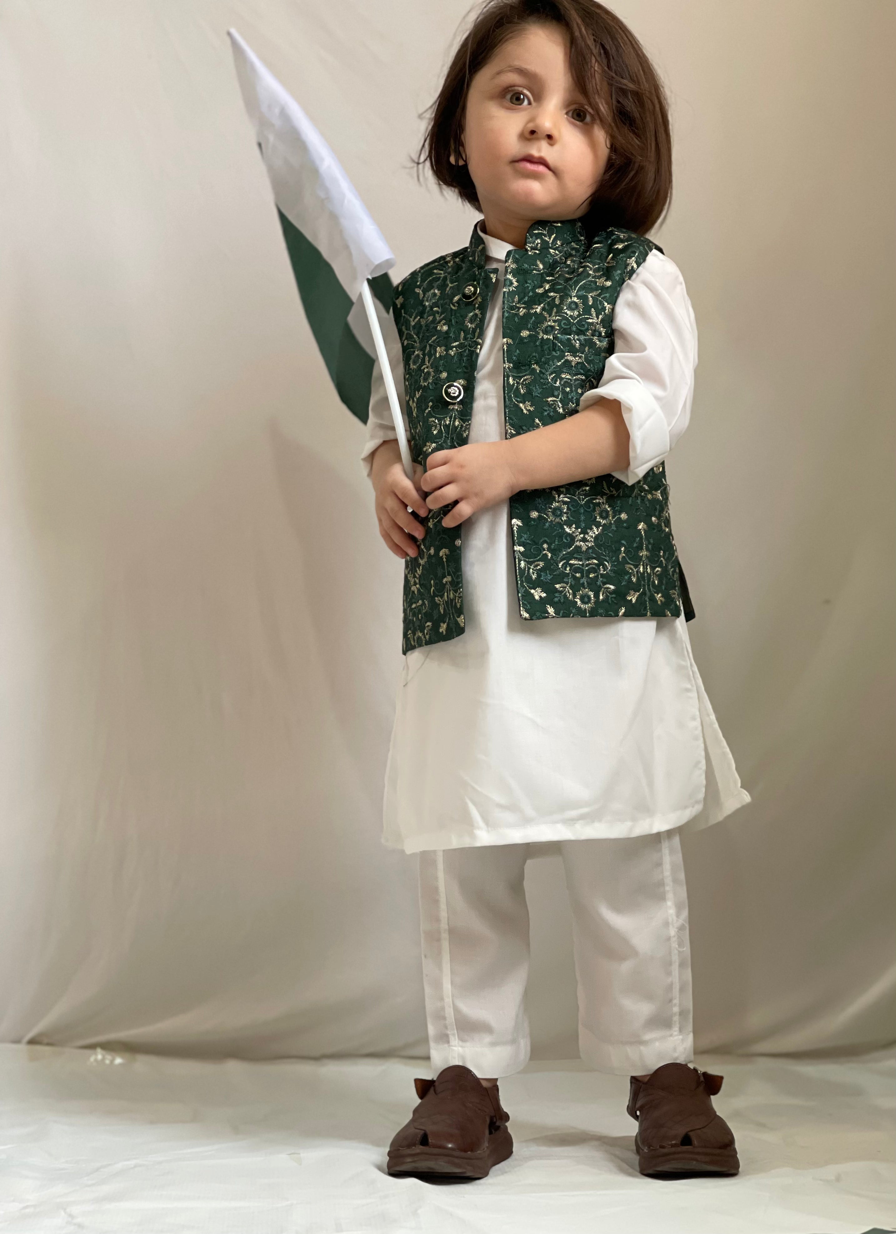 Includes Leaf Green embroidered waistcoat & white  kameez shalwar