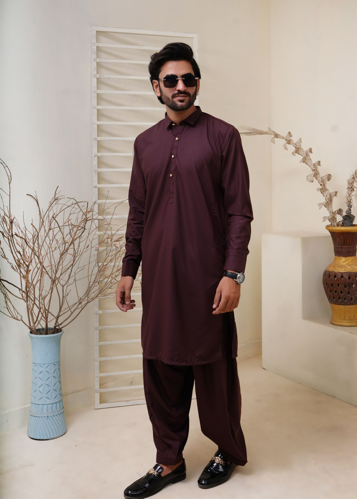 The maroon kurta with its metal button  is a stylish shade and features intricate detailing work, which adds a touch of elegance. The wash and wear fabric makes it super convenient to maintain. The shalwar is a matching maroon color, completing the look with a comfortable fit. It's the perfect combo of style and ease!