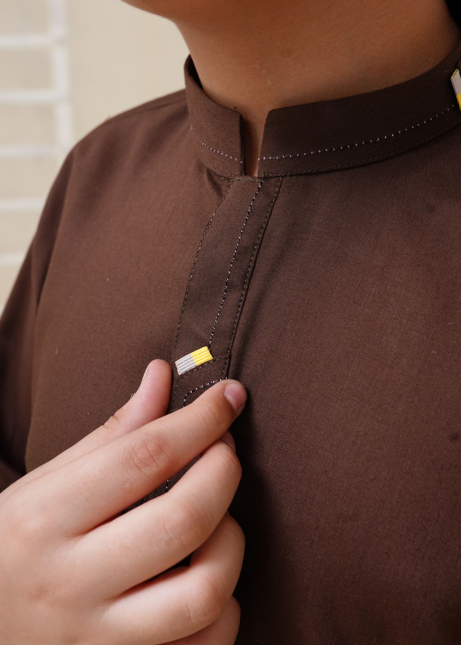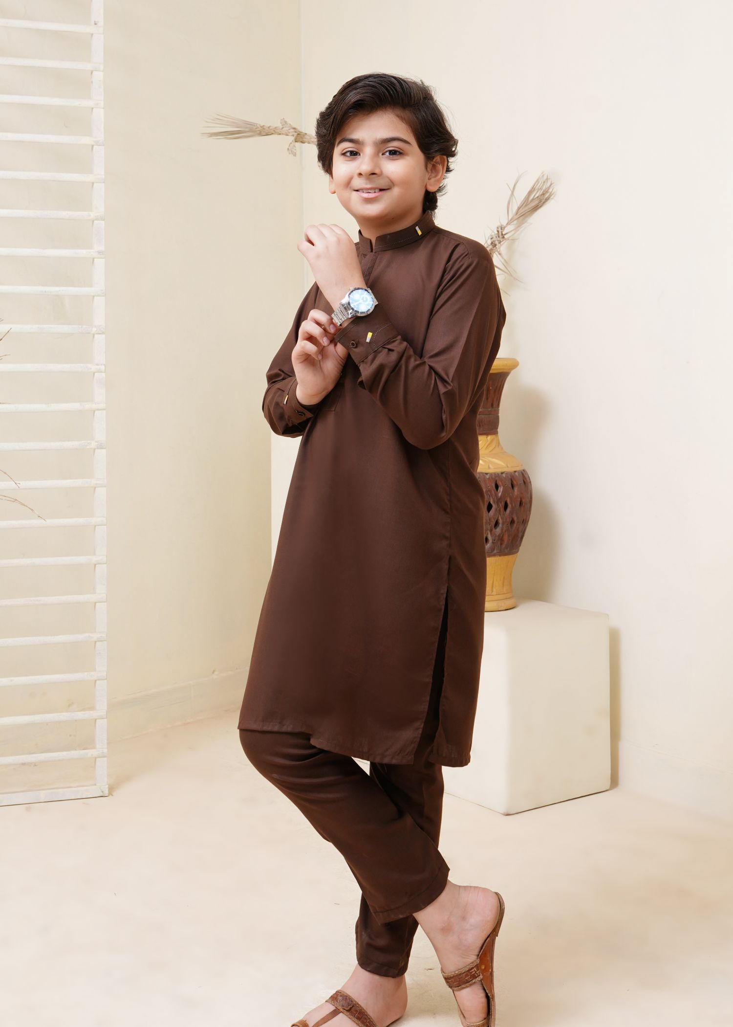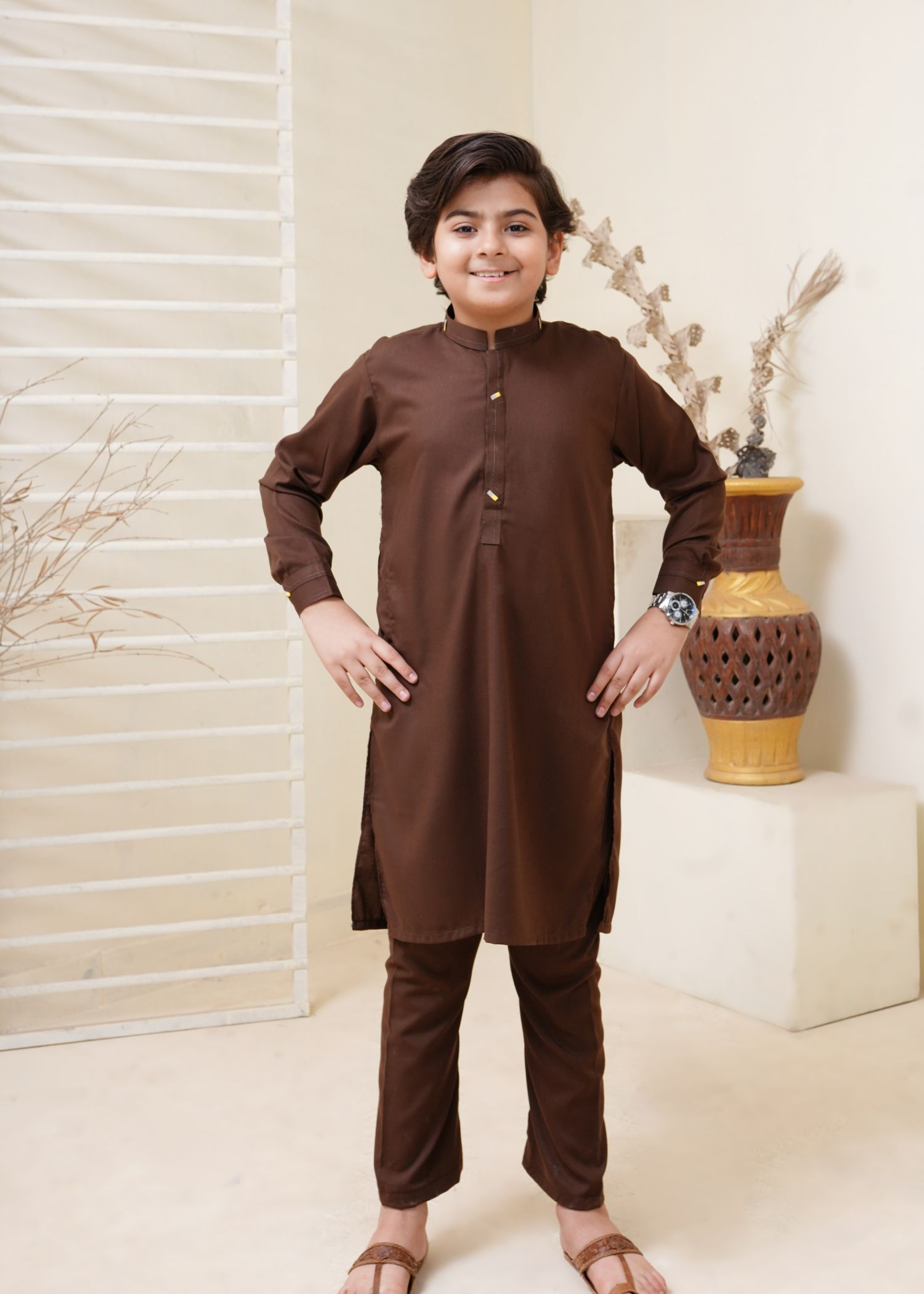 The brown kurta is a stylish shade and features intricate detailing work, which adds a touch of elegance. The wash and wear fabric makes it super convenient to maintain. The pajama is a matching brown  color, completing the look with a comfortable fit. It's the perfect combo of style and ease!